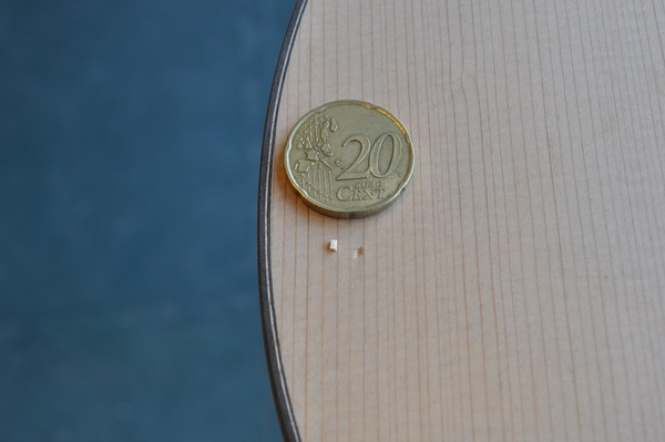 Once the old varnish has been removed there remain several dents and impact marks on the top. They have to be filled with tiny pieces of wood. They are chosen from spruce stock that closely resembles that of the top.